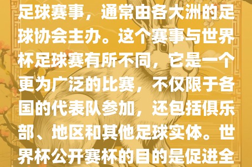 世界杯公开赛杯是一项国际足球赛事,由各大洲足球协会主办。该赛事不同于世界杯足球赛,更广泛,不仅限于国家代表队,还包括俱乐部和其他足球实体。其目的是促进全球足球的发展和交流,提高各国家和地区的足球水平。这一赛事为足球爱好者提供了展示才华和切磋技艺的舞台。