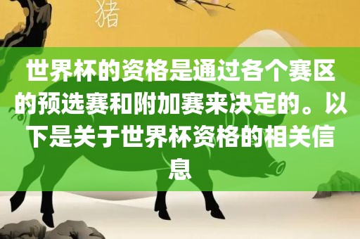 世界杯的资格取决于各赛区的预选赛和附加赛的结果。通过这些赛事,各赛区表现出色的球队将获得参加世界杯的资格。这些预选赛和附加赛对于每个参赛国家来说都是非常重要的,因为它们决定了哪些球队能够代表其国家参加世界杯。