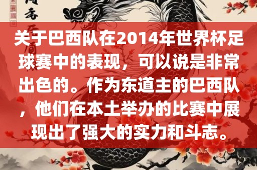 关于巴西队在2014年世界杯足球赛中的表现,可以说是非常出色的。作为东道主的巴西队,他们在本土举办的比赛中展现出了强大的实力和斗志。