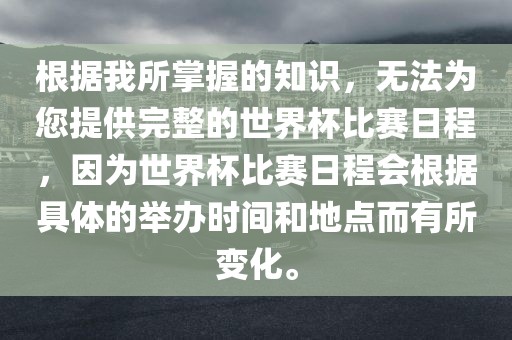 建议您通过官方渠道或相关新闻获取最新的世界杯比赛日程,您可以关注国际足联(FIFA)的官方网站、社交媒体账号或相关体育新闻网站,以获取最准确和最新的世界杯比赛日程信息。