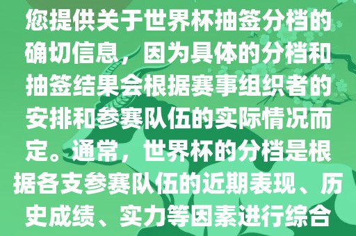 建议您关注国际足联(FIFA)的官方网站或者各大体育新闻网站和媒体,以获取最新的世界杯抽签分档信息,希望这些信息对您有所帮助。
