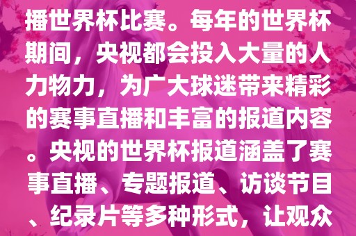 央视作为世界杯赛事的重要转播媒体,每年世界杯期间都会投入大量资源,为广大球迷带来精彩的赛事直播和丰富的报道。报道形式包括赛事直播、专题报道、访谈节目和纪录片等,让观众全面了解世界杯背后的故事和瞬间。