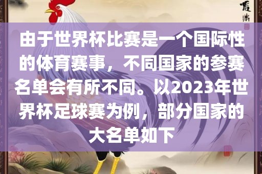 由于世界杯比赛是一个国际性的体育赛事,不同国家的参赛名单会有所不同。以2023年世界杯足球赛为例,部分国家的大名单如下