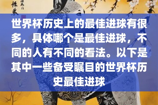 关于世界杯历史最佳进球,众说纷纭。以下是备受瞩目的几个进球简介:,,在世界杯的历史长河中,众多精彩进球留下了难以磨灭的印象。每个球迷心中都有自己心目中的最佳进球,而一些标志性进球如阿根廷球星迭戈·马拉多纳的“世纪进球”、英格兰球员加里·莱因克尔的远距离射门等,都成为了世界杯历史上的经典瞬间。这些进球以其独特的方式和震撼力,被永远铭记在足球史册中。