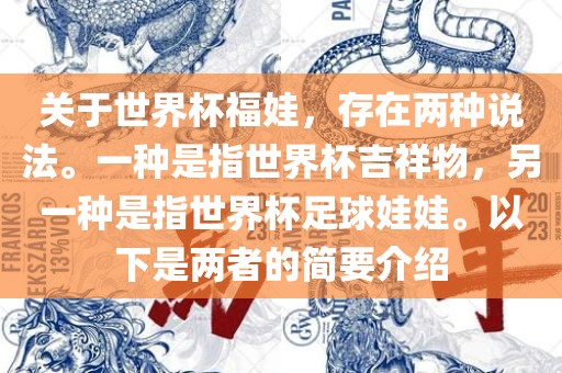 关于世界杯福娃,存在两种不同说法。一种指的是世界杯吉祥物,通常代表着主办国的文化和精神,为赛事增添欢乐氛围;另一种则指的是世界杯足球娃娃,通常是赛事期间推广足球文化的重要形象。无论是哪种,它们都代表着世界杯的欢乐氛围和足球精神。