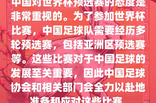 中国对世界杯预选赛的态度是非常重视的。为了参加世界杯比赛,中国足球队需要经历多轮预选赛,包括亚洲区预选赛等。这些比赛对于中国足球的发展至关重要,因此中国足球协会和相关部门会全力以赴地准备和应对这些比赛。