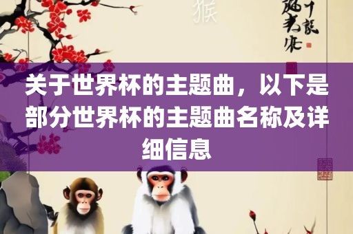 摘要:,,本文介绍了世界杯的部分主题曲名称及详细信息。这些主题曲是世界杯的重要组成部分,为比赛增添了激情和氛围。每首歌曲都有其独特的风格和旋律,反映了世界杯的精神和氛围。通过本文,读者可以了解世界杯主题曲的历史和相关信息。