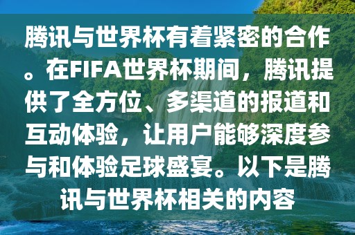 腾讯与世界杯有着紧密的合作。在FIFA世界杯期间,腾讯提供了全方位、多渠道的报道和互动体验,让用户能够深度参与和体验足球盛宴。以下是腾讯与世界杯相关的内容