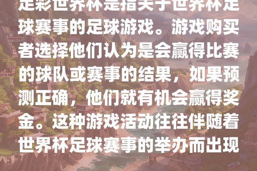 摘要:足彩世界杯是一种基于世界杯足球赛事的足球游戏,玩家通过预测比赛结果来参与游戏,有机会赢得奖金。这种游戏活动通常伴随着世界杯足球赛事的举办而出现,玩家可以选择他们认为会获胜的球队或赛事结果。