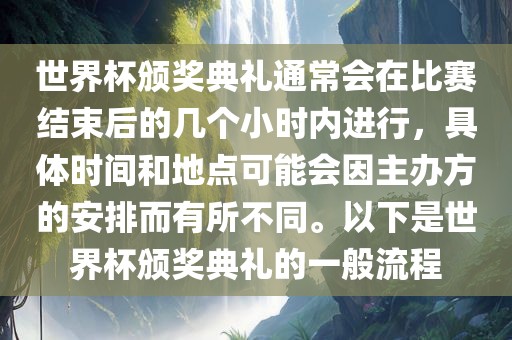 世界杯颁奖典礼通常会在比赛结束后的几个小时内进行,具体时间和地点可能会因主办方的安排而有所不同。以下是世界杯颁奖典礼的一般流程