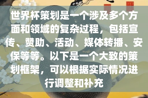 世界杯策划是一个涉及多个领域的复杂过程,包括宣传、赞助、活动、媒体转播和安保等。策划框架大致包括:进行市场调研,确定宣传策略,寻求赞助商和合作伙伴;组织各类活动,增强球迷参与感;安排媒体转播,确保赛事全球覆盖;同时重视安保工作,保障赛事顺利进行。根据实际情策划框架可灵活调整补充。