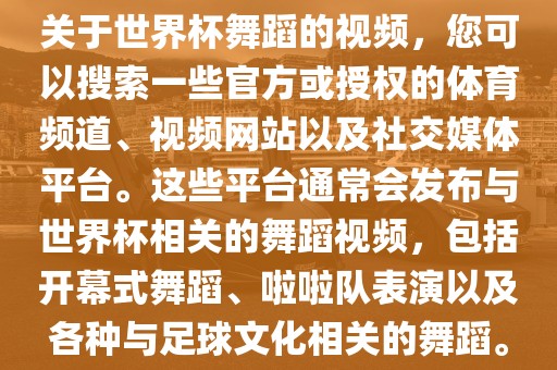 您可以在YouTube、抖音、快手等视频网站上搜索关键词如“世界杯舞蹈视频”、“世界杯开幕式舞蹈”等,以找到相关的视频,一些官方体育频道如CCTV-5等也可能会直播或回放世界杯相关舞蹈表演。