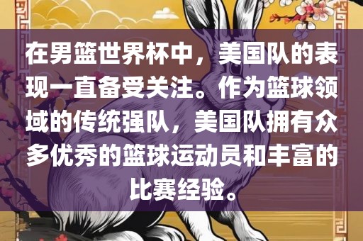 值得注意的是,美国队在男篮世界杯中的表现和成绩不仅取决于球队的整体实力和状态,还受到诸多因素的影响,如对手实力、比赛环境、球员伤病等,无法简单地预测美国队在男篮世界杯中的表现。