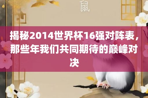 摘要:本文将为你揭秘2014年世界杯足球赛的16强对阵表,带你回顾那些年我们共同期待的巅峰对决。文章将详细介绍各组球队之间的激烈比拼,以及那些令人热血沸腾的瞬间。重温那些经典战役,让我们再次感受足球的魅力。
