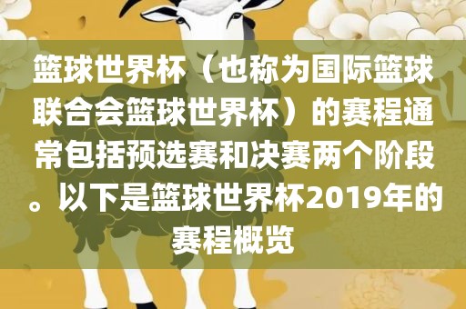 篮球世界杯(也称为国际篮球联合会篮球世界杯)的赛程通常包括预选赛和决赛两个阶段。以下是篮球世界杯2019年的赛程概览
