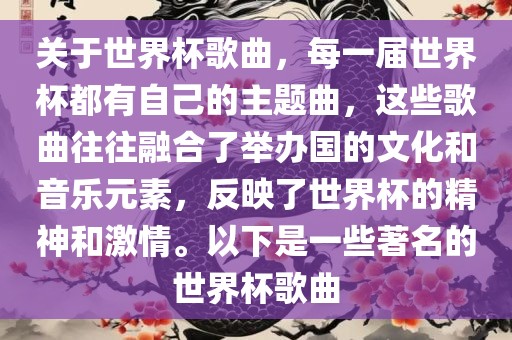 关于世界杯歌曲,每一届世界杯都有自己的主题曲,这些歌曲往往融合了举办国的文化和音乐元素,反映了世界杯的精神和激情。以下是一些著名的世界杯歌曲