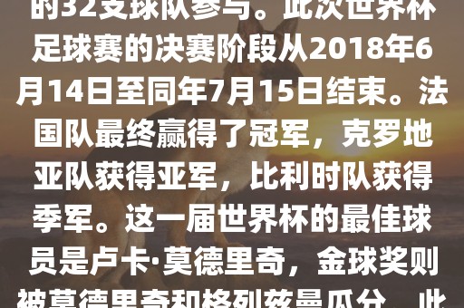 摘要:2018年俄罗斯世界杯是第21届足球赛事,全球32支球队参与。法国队赢得冠军,克罗地亚和比利时分别获得亚军和季军。最佳球员为卢卡·莫德里奇,金球奖被莫德里奇和格列兹曼分享。该届世界杯创造了多项纪录和亮点,观众人数创新高。