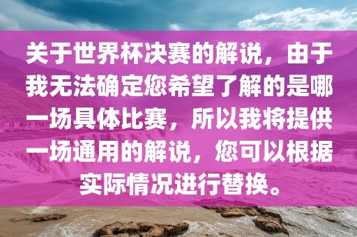 关于世界杯决赛的解说,由于我无法确定您希望了解的是哪一场具体比赛,所以我将提供一场通用的解说,您可以根据实际情况进行替换。