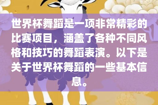 世界杯舞蹈是一项非常精彩的比赛项目,涵盖了各种不同风格和技巧的舞蹈表演。以下是关于世界杯舞蹈的一些基本信息。
