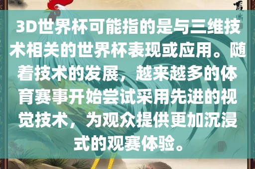 不过请注意,具体“3D世界杯”的应用和内容可能会随着时间和技术的不同而有所变化,建议关注相关的官方信息和技术发展,以获取最准确和最新的内容。