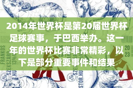 2014年世界杯是第20届世界杯足球赛事,于巴西举办。这一年的世界杯比赛非常精彩,以下是部分重要事件和结果