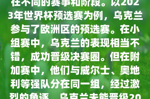 至于其他时间段的世界杯预选赛,乌克兰的表现也有所不同,有时他们能够成功晋级决赛圈,有时则未能晋级,如果您想了解关于乌克兰世界杯预选赛的更具体信息,建议查看相关的新闻报道或访问相关的足球比赛网站。